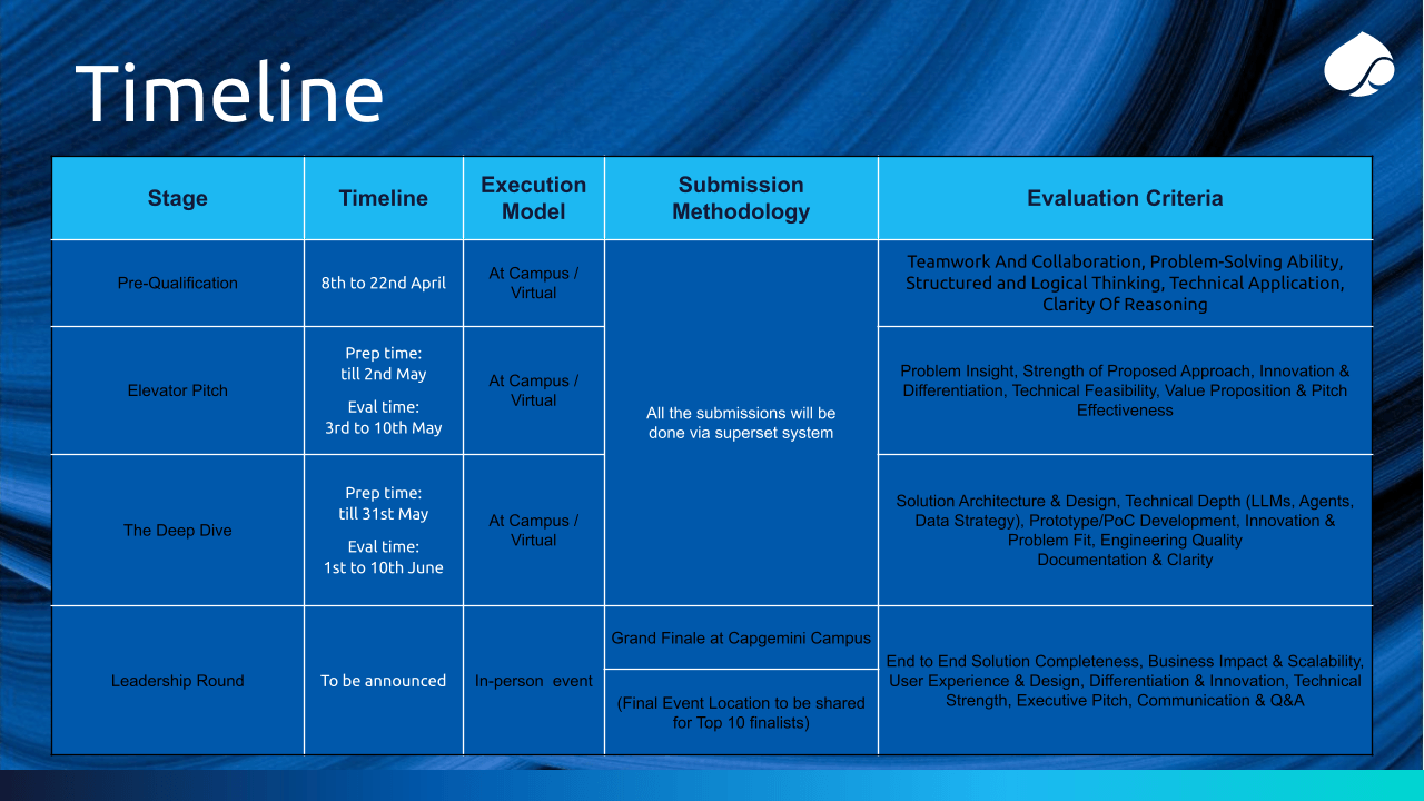 - Evaluation will consider problem understanding, innovation, technical depth, execution quality, and real-world applicability of the proposed solutions. Judges will also review consistency across rounds, prototype maturity, and alignment with GenAI and Agentic AI requirements.
